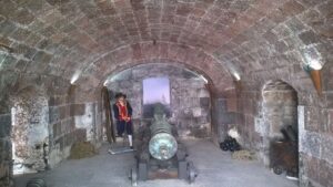 Sus fondos se distribuyen en dos grandes salas semicirculares, de gran belleza arquitectónica, con sus arcos de medio punto y gran número de argollones alineados con las troneras, del que sólo uno fue utilizado, cuando el cañón El Tigre se puso sobre su cureña.