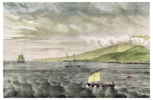 Cuando los H.M.S. Lion, Indostán y Chakal, se iban acercando a la isla, divisamos el Pico que compite en altitud con las tierras más altas del viejo continente, aunque en este caso no parece responder a la idea de colosal eminencia que la imaginación espera encontrar; de hecho, las montañas que se alzan junto a él le restan altura.